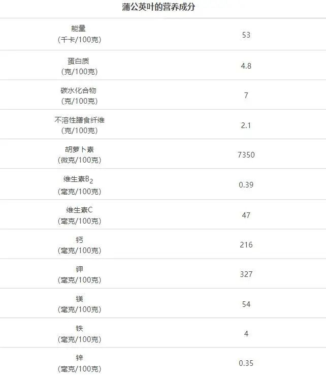 维生素K含量上的表现更是值得夸夸,甚至超过了在“维生素K含量最丰富的常见食物”排行榜上名列前茅的菠菜(483微克/100克),高达778微克/100克除此之外,蒲公英的维生素B2含量也不错吃100克蒲公英叶子,就能满足一个成年女性每日维生素B2需求的32.5%。