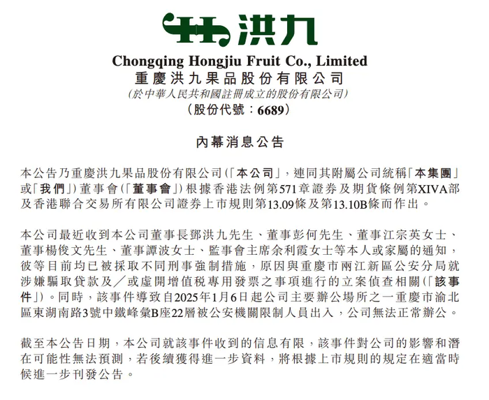 文 | 趣解商业 郝文停牌一年多的“水果第一股”洪九果品(6689.HK)突然暴雷4月16日,洪九果品发布内部公告称,包括洪九果品董事长邓洪九、董事彭何、董事江宗英、董事杨俊文、董事谭波、监事会主席余利霞在内的6名核心高管目前均已被采取不同刑事强制措施,原因与重庆市两江新区公安分局就涉嫌骗取贷款及或虚开增值税专用发票的事项进行立案侦查相关。