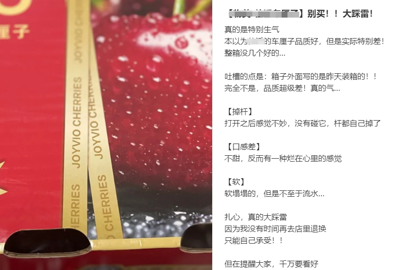 值得注意的是,随着进入智利车厘子的产季进尾期,车厘子品质波动问题开始集中显现,客诉率显著攀升社交平台上各平台、各直播间智利车厘子“果肉软烂”“果柄发黑”“以次充好”等投诉激增,甚至有用户反映购买的十斤车厘子中坏果至少有三斤。