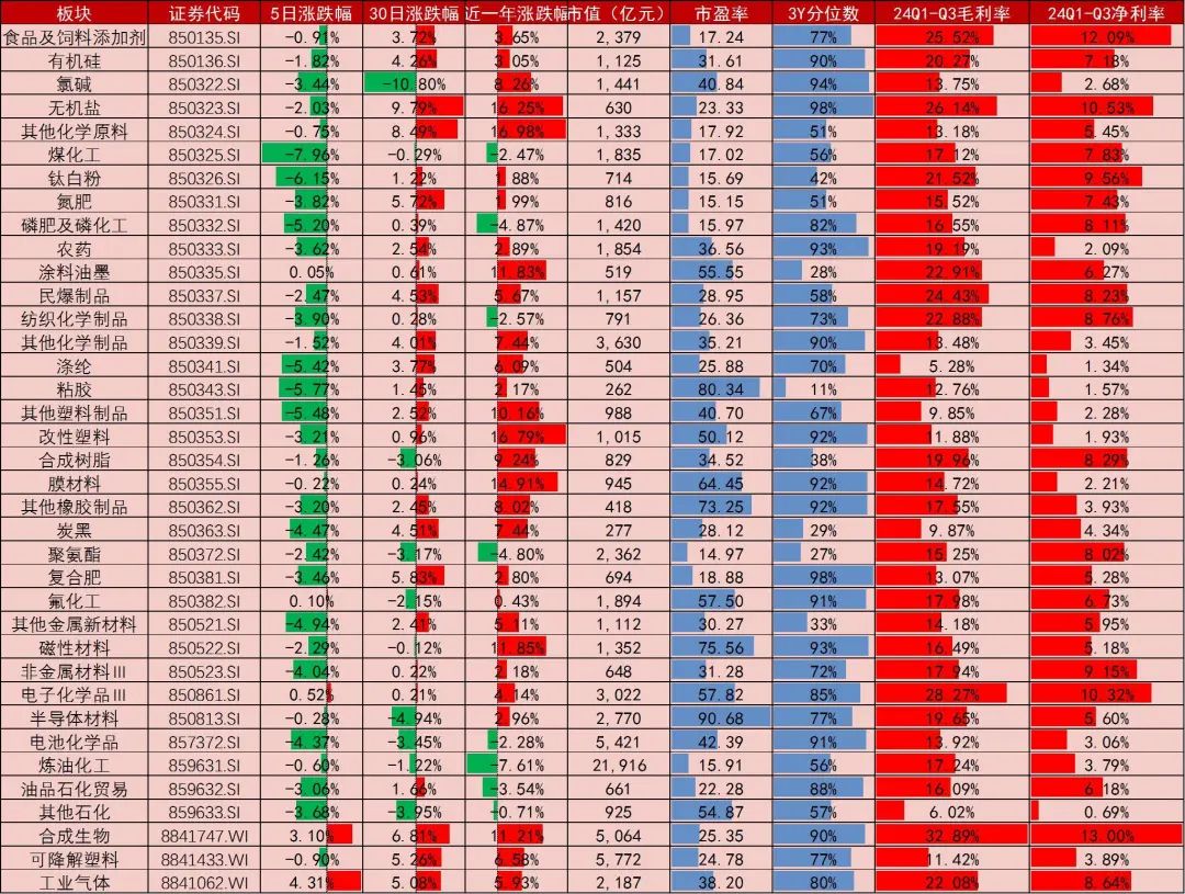 图3:化工新材料板块表现、估值及盈利能力情况