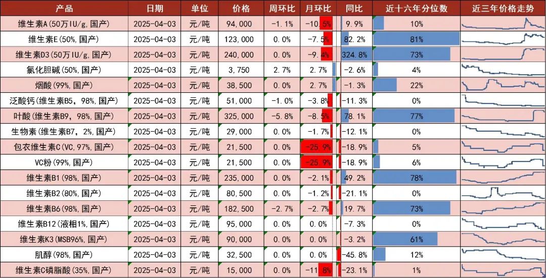 维生素A(94000元/吨,-1.05%)、维生素E(123000元/吨,不变)、维生素D3(240000元/吨,不变)、泛酸钙(51000元/吨,-0.97%)、肌醇(32500元/吨,不变)工业气体及湿电子化学品: