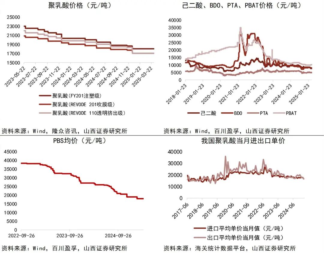 资料来源:Wind,博亚和讯,山西证券研究所可降解塑料截至2025年4月6日,聚乳酸(FY201注塑级)价格为18000元/吨,较上周不变;聚乳酸(REVODE 201吹膜级)的价格为17000元/吨,较上周不变;聚乳酸(REVODE 110透明挤出级)的价格为17000元/吨,较上周不变;玉米均价为2257.65元/吨,较上周下降0.29%,环比上月价格降低5元。