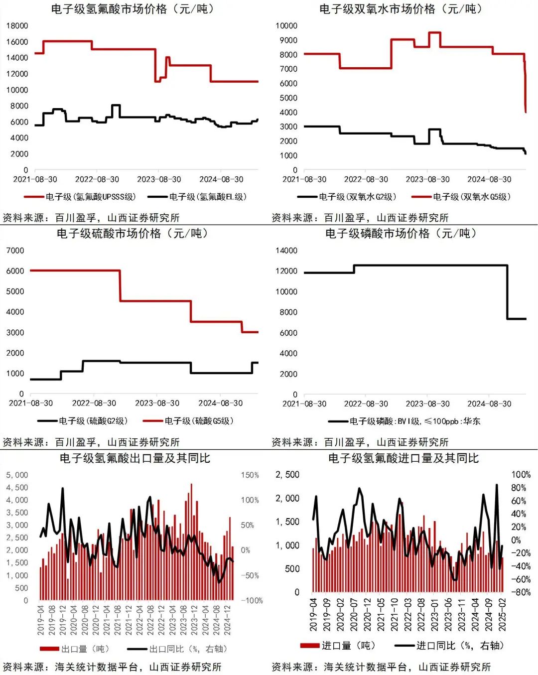 资料来源:Wind,百川盈孚,山西证券研究所电子化学品2025年4月6日,国内UPSSS级氢氟酸价格为11000元/吨,较上月不变;EL级氢氟酸价格为6200元/吨,较上月上涨3.33%;G2级双氧水价格为1100元/吨,较上月下降24.14%;G5级双氧水价格为4000元/吨,较上月下降50.00%;G5级硫酸价格为3000元/吨,较上月不变;G5级氨水价格为4000元/吨,较上月不变;BVI级磷酸(≤100ppb)价格为7300元/吨,较上月不变。
