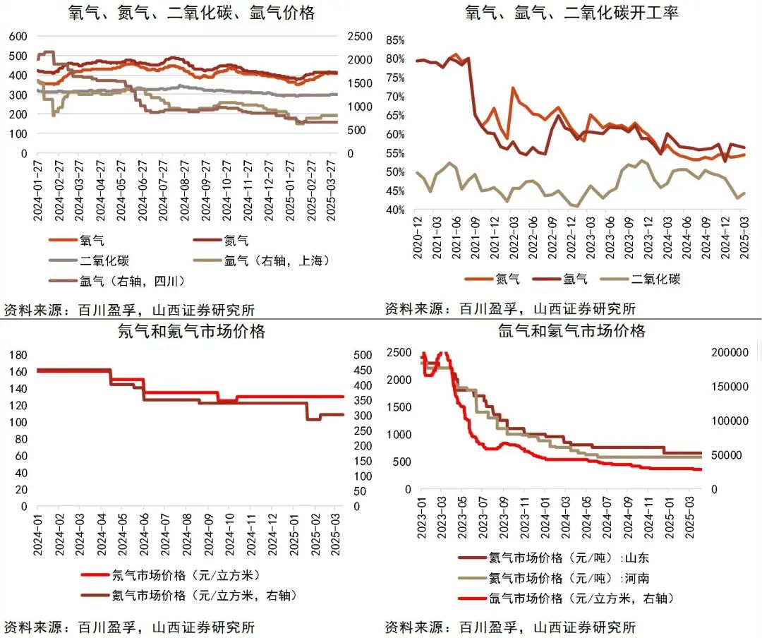 资料来源:Wind,海关统计数据平台,山西证券研究所工业气体2025年4月6日,氧气单价为412元/吨,较上月上涨6.74%;氮气单价为410元/吨,较上月下降0.73%;二氧化碳单价为301元/吨,较上月上涨2.03%;氢气单价为2.5元/立方米,较上月下降0.40%;四川氩气单价为650元/吨,较上月不变;氖气单价为130元/立方米,较上月不变;氪气单价为300元/立方米,较上月不变;氙气单价为28000元/立方米,较上月下降2.61%;2025年3月,国内氮气开工率为54%,氩气开工率为56%,二氧化碳开工率为44%。