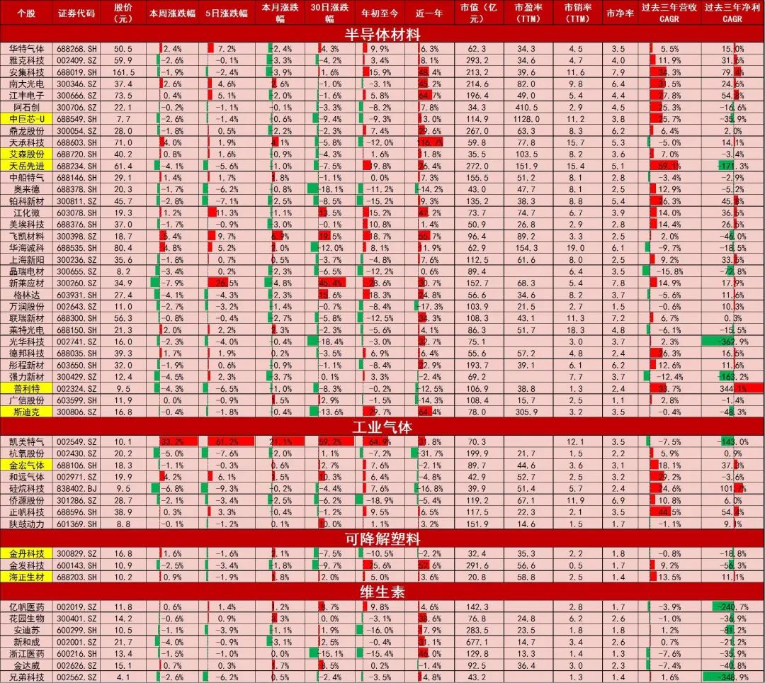 资料来源:Wind,山西证券研究所图4:公司市场表现、估值及盈利情况(半导体材料、工业气体、可降解塑料、维生素)