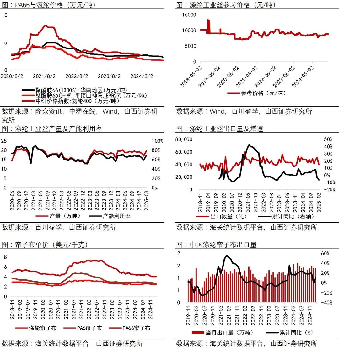 资料来源:Wind,海关总署,百川盈孚,山西证券研究所2025年4月3日,聚酰胺66(注塑,平顶山神马,EPR27)价格为1.7万元/吨,较上周下降2.86%2025年2月,涤纶工业丝出口39523吨,累计同比下降-6.80%;截至2025年2月,涤纶帘子布价格为2.37美元/千克,较上月环比上升0.49%;PA6帘子布价格为2.6美元/千克,较上月环比下降1.30%;PA66帘子布价格为3.95美元/千克,较上月环比下降1.16%。