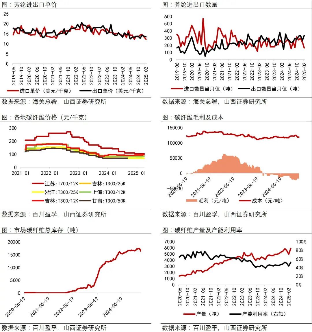 资料来源:博亚和讯,中国饲料工业协会,山西证券研究所高性能纤维2025年2月,芳纶进口单价为12.29美元/千克,出口单价为13.38美元/千克;进口161吨,环比下降32.80%;出口331吨,环比上升23.47%。